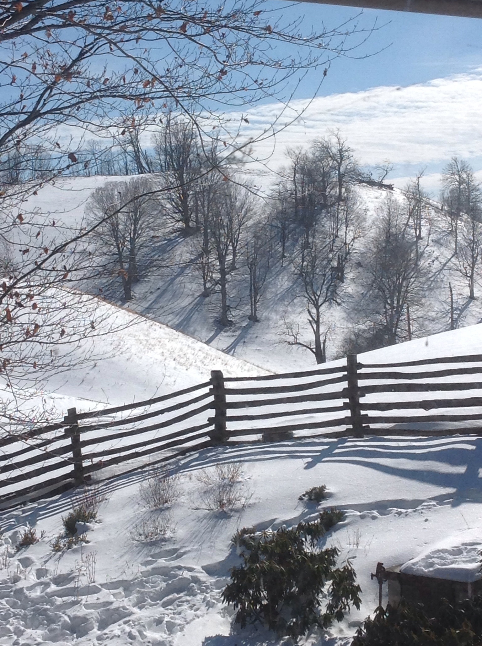 Where the hollow tapers, to the south, the sky colors in hues of apricot, lavender, chocolate. I rush out to catch them but they have gone. It is all happening so fast. Night comes, and it will snow again.