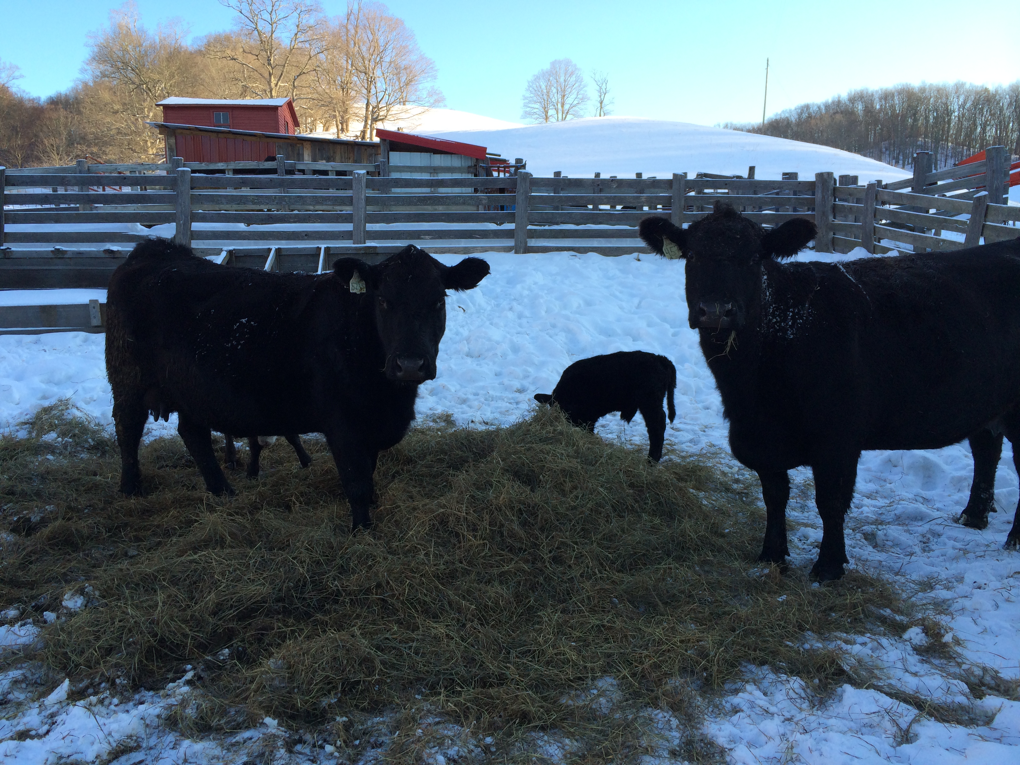 A few hours later, two crows appear in the blasted walnut tree in the sinkhole. One crow leaves. One remains. Lovely, simple math. Now there are two again. One flashes away, then the other. Back and forth they go. If they left contrails like planes, it would be quite a tangle in the sky. By midday the juncos are visiting the cows and yearling sheep in the pen by the old house picking up hayseed. They are very busy. The crows take an interest as well. Two cows and their calves sit soaking up the sun. Occasionally one rises to spray steaming manure or lick the face of her calf, but mostly they sit, face to the sun, soaking up heat, to balance those minus 15-degree nights of the week before. Black crow on white snow. Black Angus on brown hay on white snow. Juncos gray and white. Butterscotch barn cat lolls along in the sled tracks, confident that the dogs are worn out, asleep.