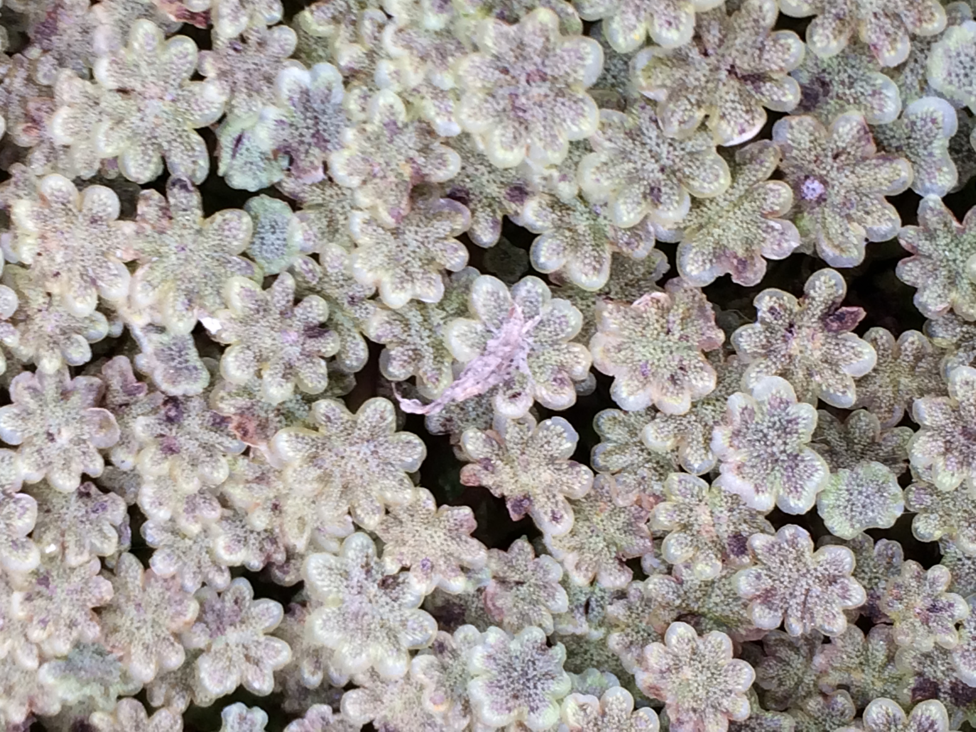 View of gemmae cups, which are a means of asexual reproduction. Sometimes called splash cups, the they hold little balls of tissue that splash out in the rain, spreading the plant vegetatively rather than sexually. (I apologize for the focus, but I find it hard to hold my iPhone steady while on my hands and knees with the dogs breathing down my neck, intensely interested in what I am doing.