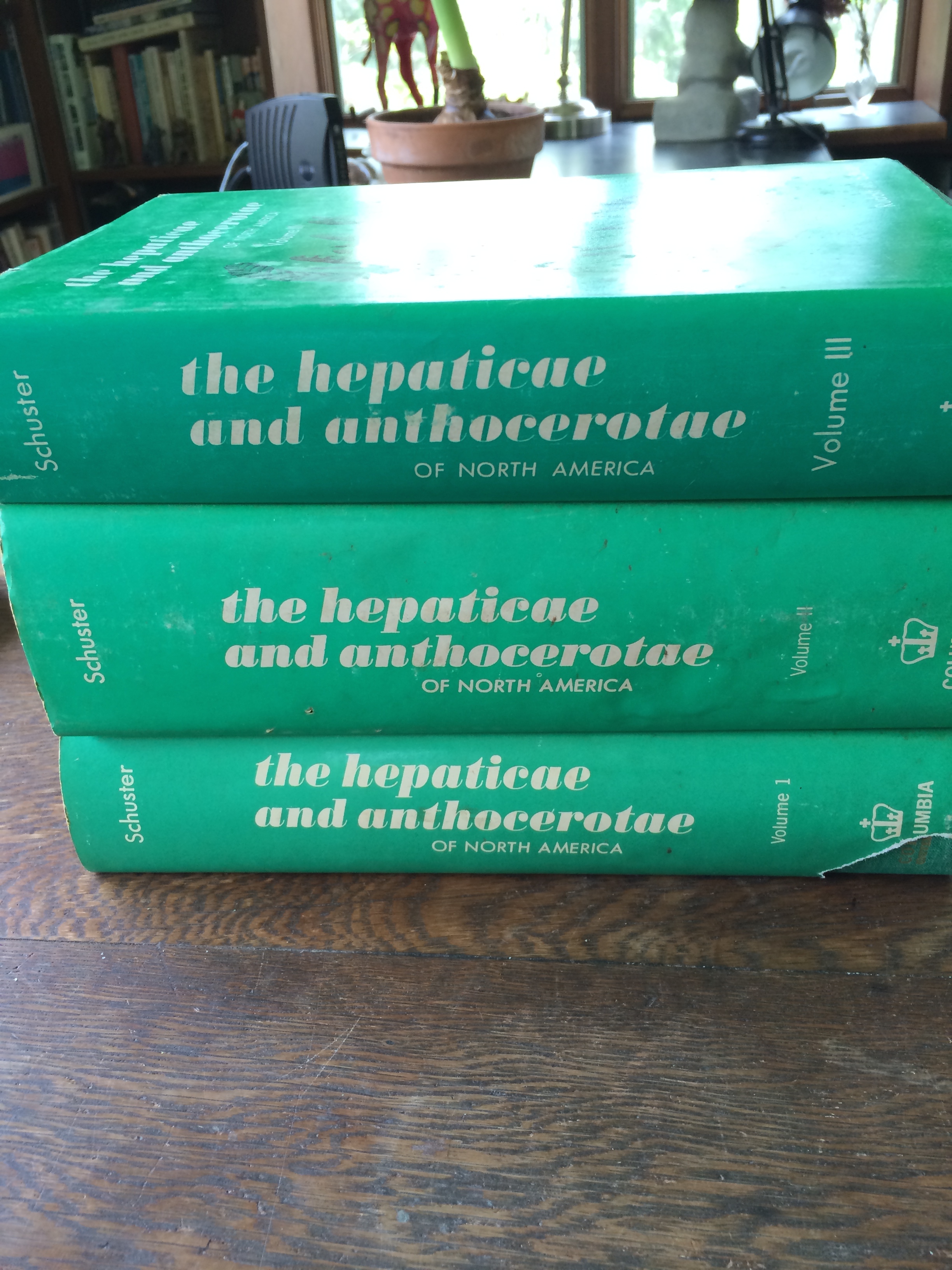 Schuster’s three volumes are a work of art and, as the epigraph above suggests, one good reason for lack of brevity is a textual appreciation for the diversity of flora and fauna found on planet Earth. I have learned that Professor Schuster only recently died, at 91, after a lifetime as a professor, world explorer, bryologist (one who studies mosses), botanist, and writer. Early in his career he studied at Cornell University, which is where I completed my graduate studies in botany, and not very far from where I am writing this blog. The scope of Professor Schuster’s three-volume work is daunting. For the beginner hepaticologist I recommend Non-flowering Plants, a Golden Nature Guide. This is a wonderful series and I often go to one of their guides to get my bearings in some aspect of the natural world–minerals, spiders, seashells, fossils, ….
