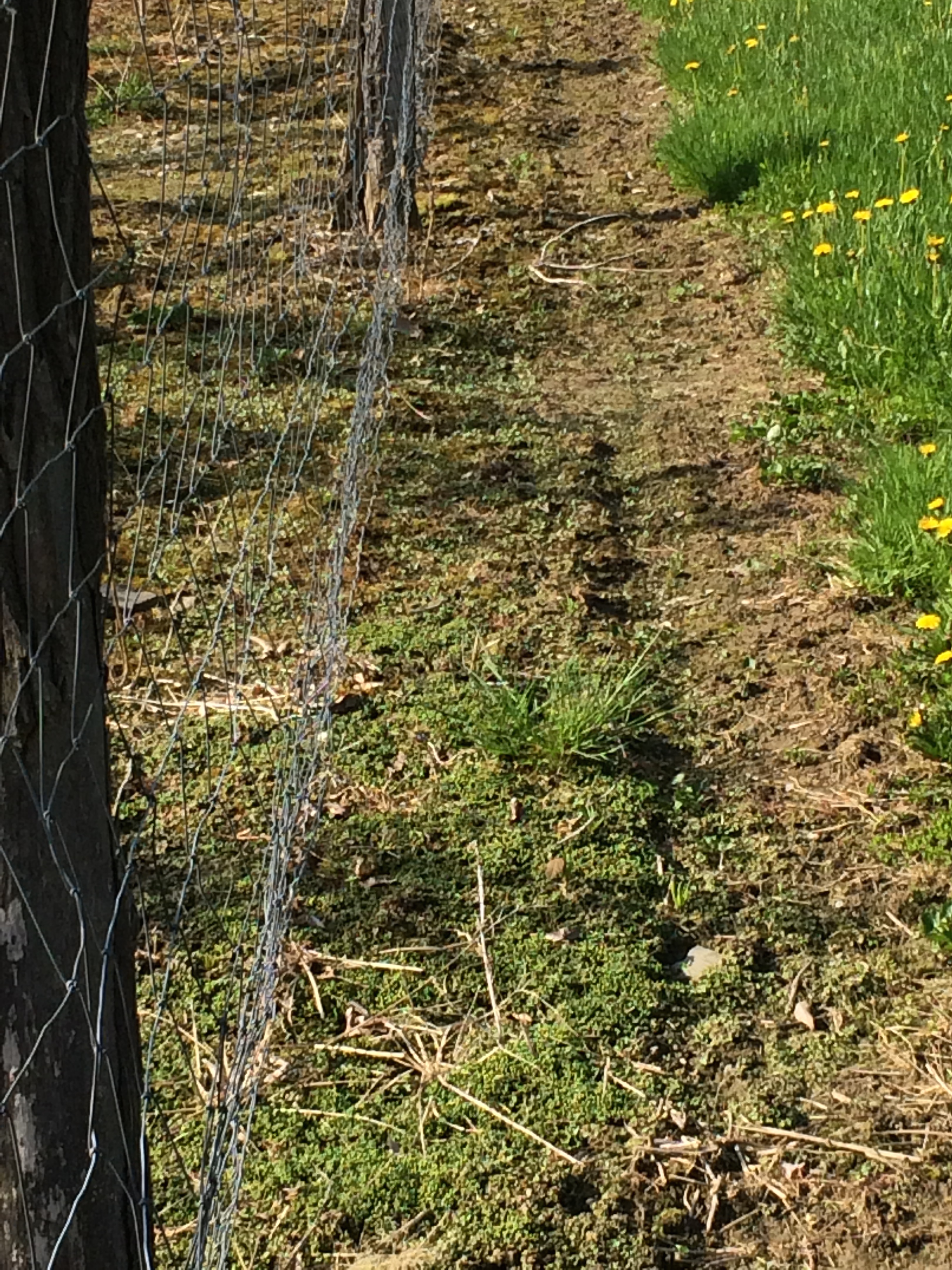 I walk near the fence line of the enclosure. I see bare earth and something more.