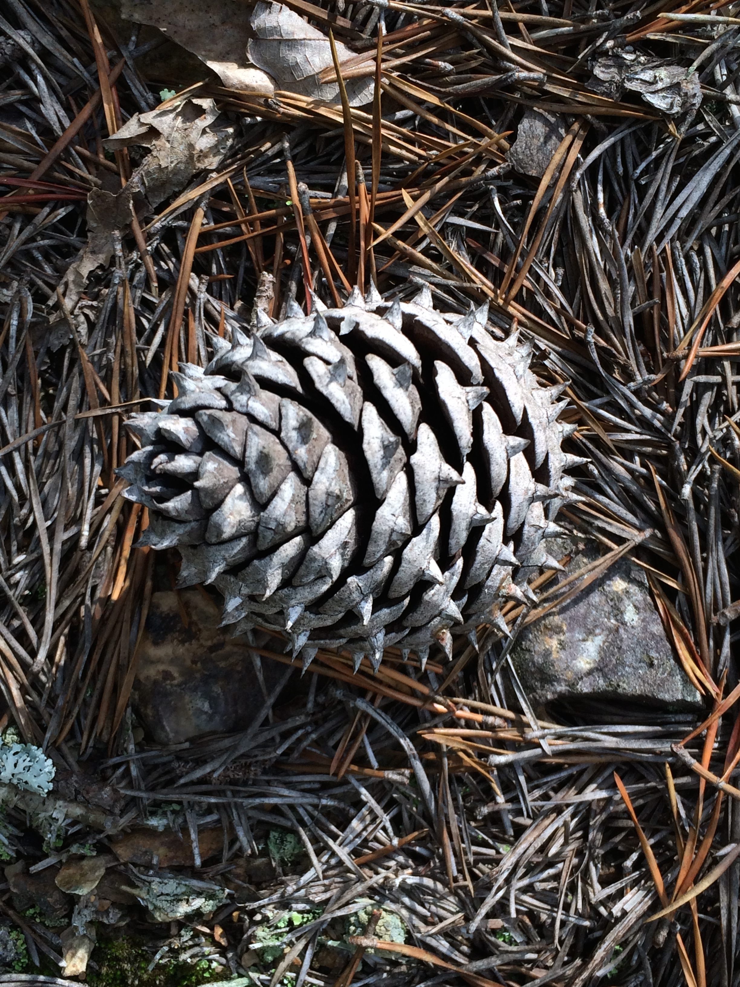 Whether nesting in lichens or pine needles, each cone seemed to be at home. Like sunflowers, pine cones have a deeply satisfying architectural form, the scales overlapping in an arrangement reflecting a sequence of numbers called the Fibonacci series. These cones are striking for their silvery gray brown shading and the curving, decorative prickles at the end of each scale.