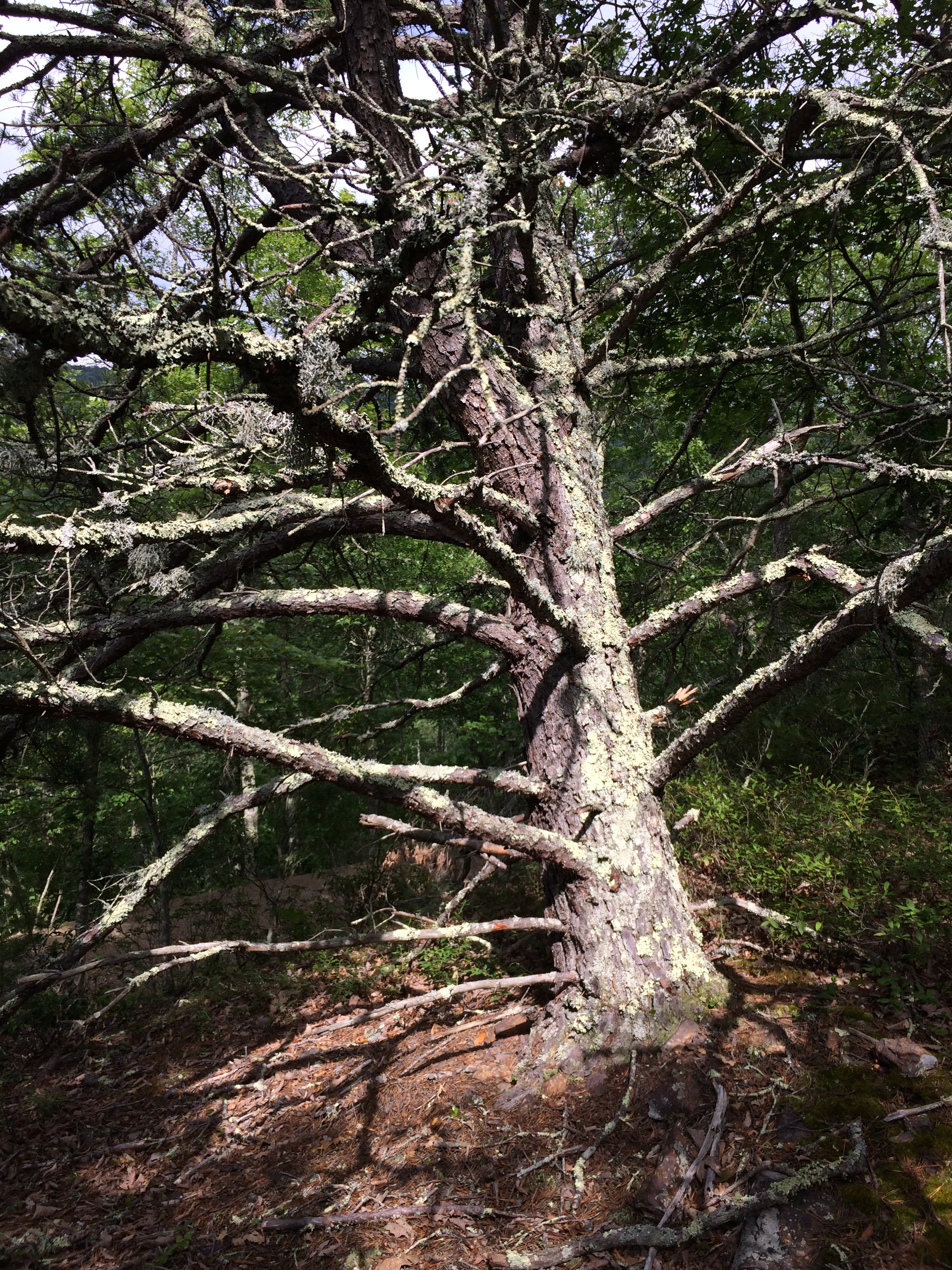 Voila Pinus pungens, commonly known as the prickly pine, table mountain pine, and hickory pine! Prickly pine is certainly a suitable common name because of the cone, and table mountain because of the high elevation at which it likes to grow, but hickory pine? A hickory tree is in a completely different family and order and is known for its shaggy bark and edible nuts. I love it when the common names of life forms become interesting metaphors, connecting the unlike through some hint of likeness, so I puzzle over its derivation. Hickory trees are often gaunt and gangly in shape, which is perhaps the likeness that inspired the common name of hickory pine because Pinus pungens is described as having a “rounded, irregular shape.” Another possibility is that the common name recognizes the fact that Pinus pungens likes to grow with hickories. However, there were no hickories on this rocky hillside.