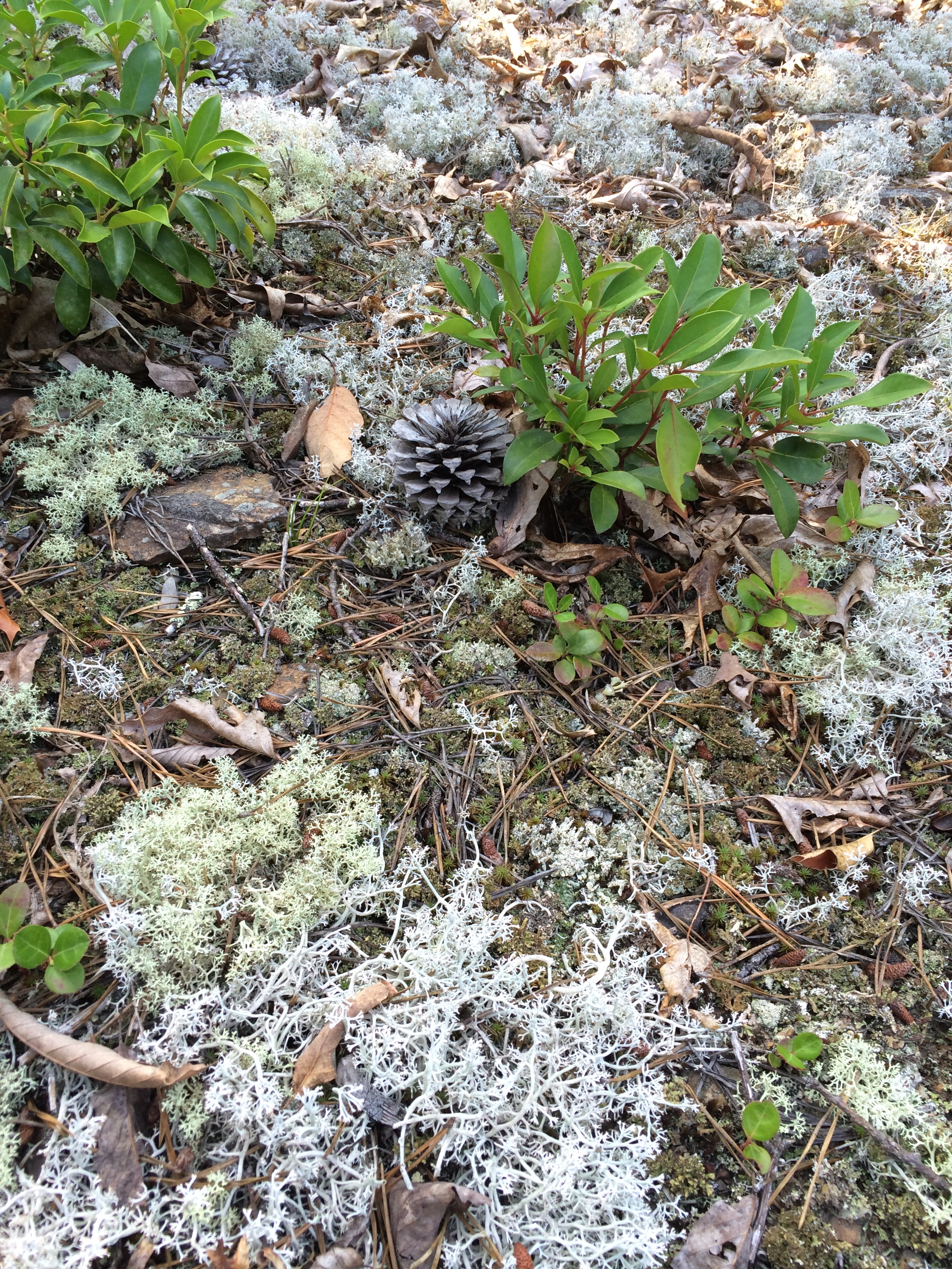 ATVs are bumpy, noisy, and smelly, but they aid enormously in botanizing and can be turned off while one explores on foot. My husband and I had driven up this part of the logging trail maybe half a dozen times, but never stopped to get out at this particular turn in the road. Maybe it was the morning light shining on an expanse of silvery pale green lichens that caught our eyes, but soon enough we were trying to hop about on delicate feet, in thrall to the wonders underfoot in what I am calling the pine cone garden.