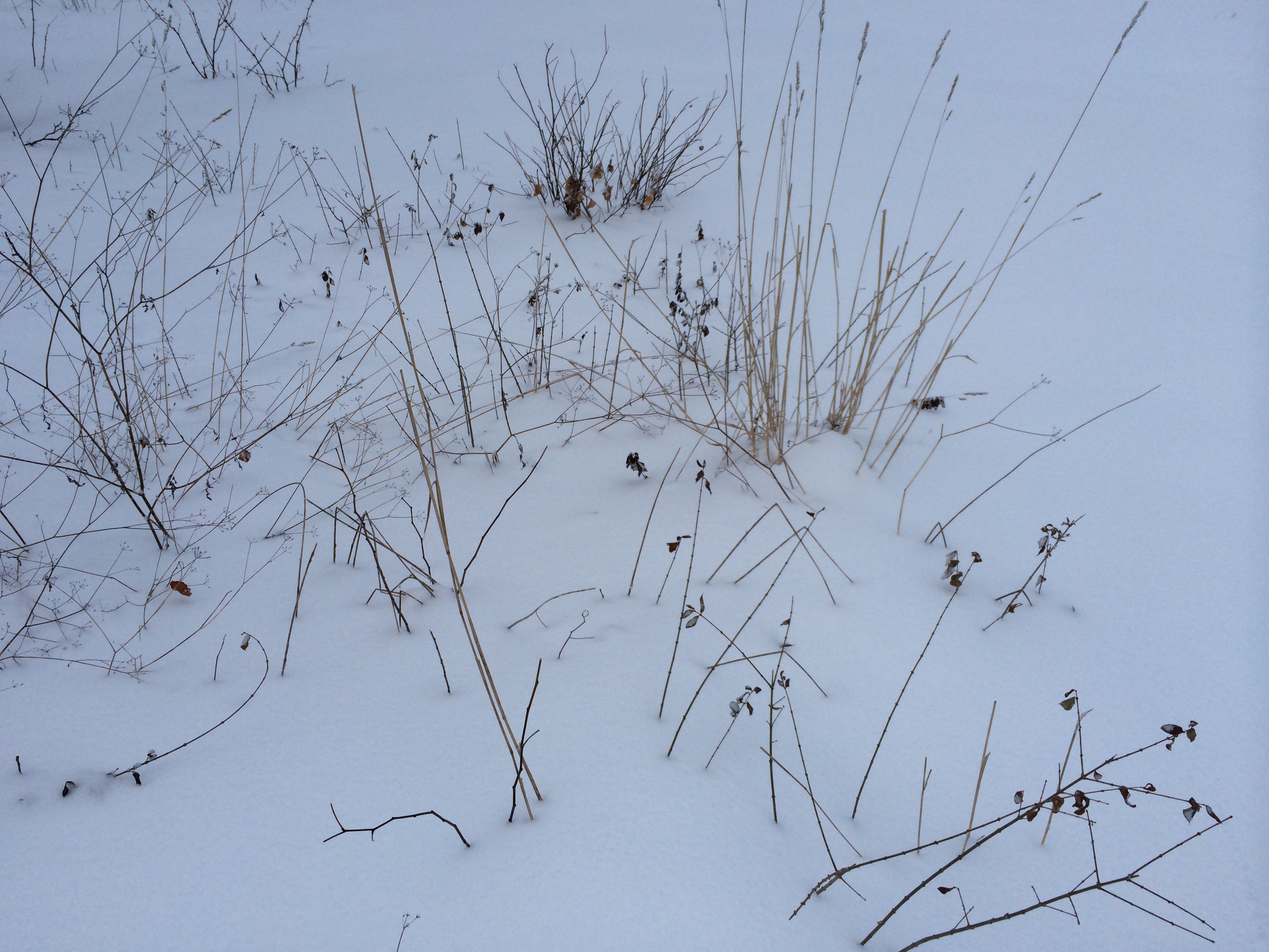 I see the brown-and-white skeletons of summer’s weeds against the winterwhite of early morning. The snow reveals their delicate structure clearly now. In summer they probably appeared nondescript, without definition, to most passers by.