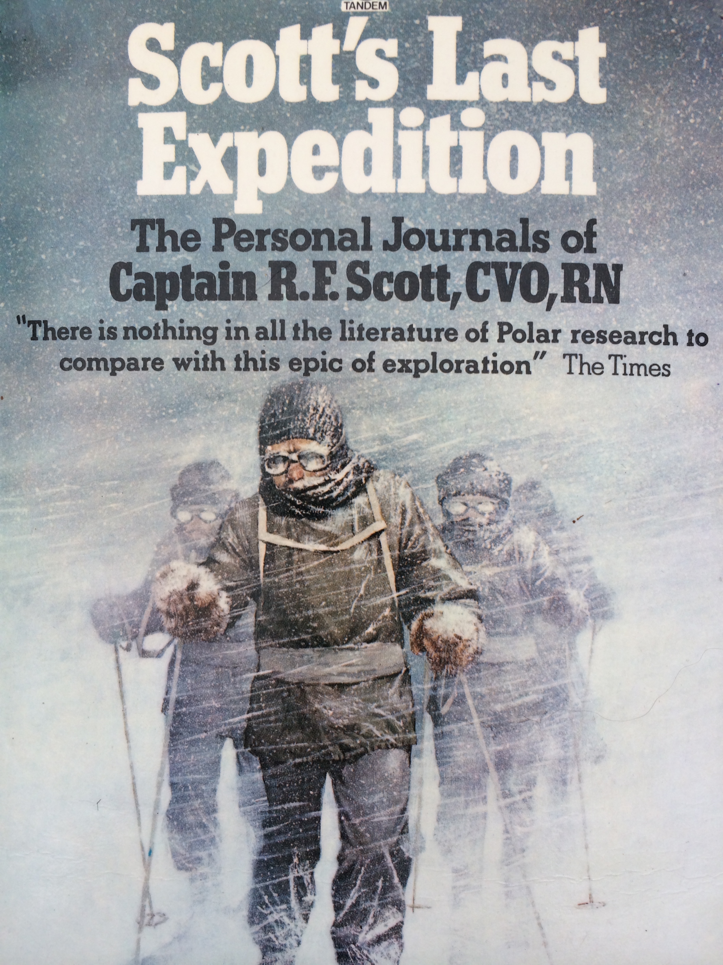 The next day I found an old paperback in my parents’ library room over the root cellar. There it was, an appropriate choice for the season–Scott’s Last Expedition: The Personal Journals of Captain R. E. Scott, CVO, RN. Found next to his frozen body, the diary is compelling reading even though we know the tragic outcome. One can read it over and over, trying to comprehend the predicament of this small group of men. Scott and his team are very near the South Pole traveling under extreme conditions when they find a black flag and sledge and dog tracks indicating that the Norwegians had made it there first. They had lost “priority.” Scott writes, “Many thoughts and much discussion have we had. To-morrow we must march on to the Pole and then hasten home with all the speed we can compass. All the day dreams must go….”