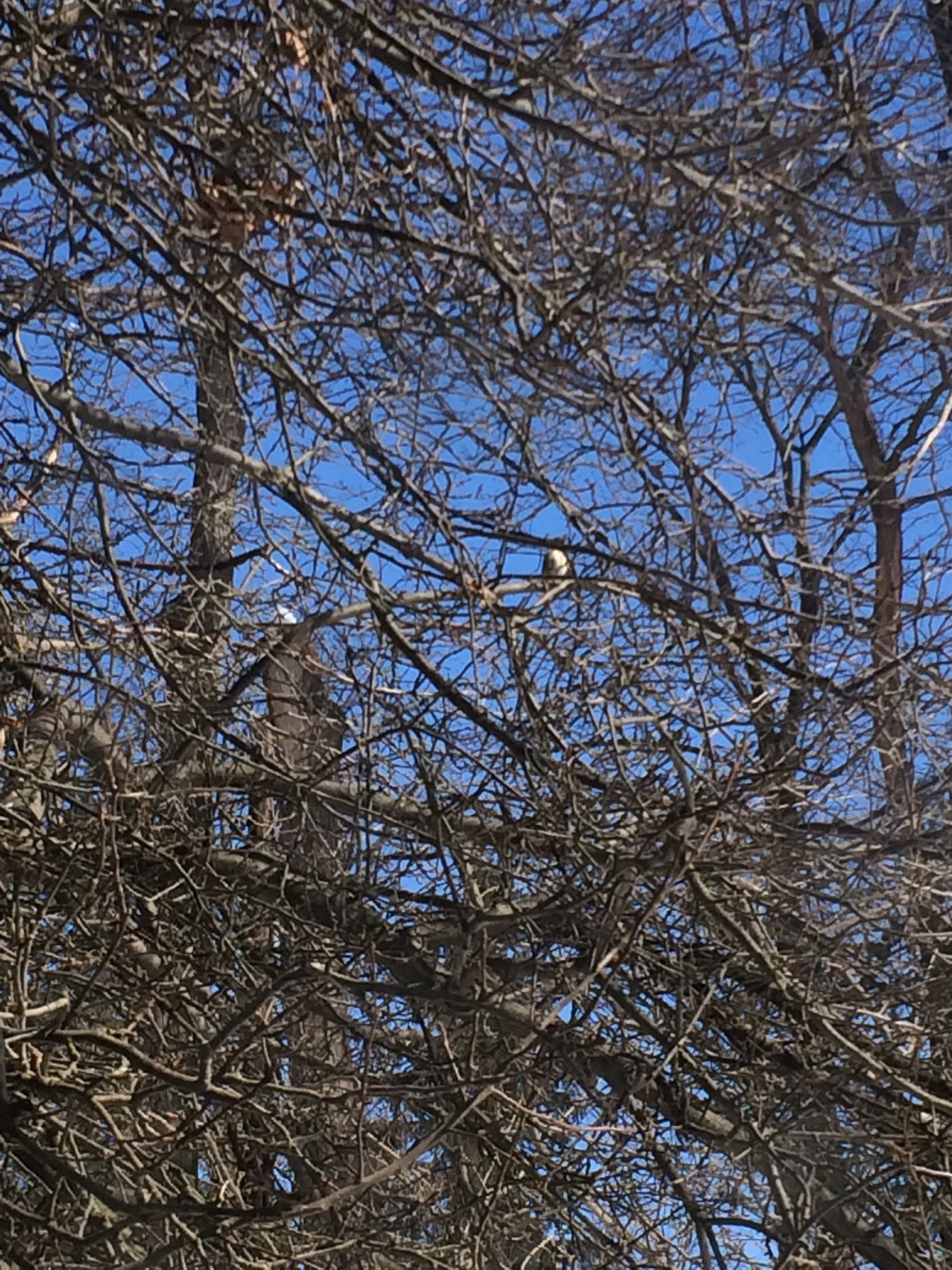 Today I decided to stand at the window observing. I stood and the tufted titmouse sat, silent for once. This went on for quite a while. Sometimes the branches of the apple tree distracted me. That’s when I noticed the second tufted titmouse. There she/he was, higher up in the tree. So, silence because mission accomplished? The mate has acquiesced? I don’t know, but I will be looking into the habits and psychology of this hardy little bird.