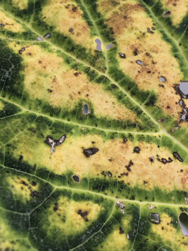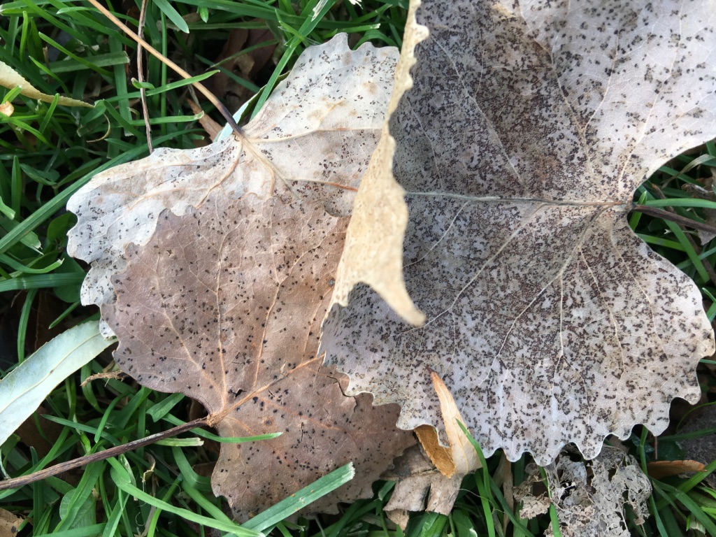 Looking at fallen leaves can be an adventure into observing both the beauty and mortal effects of predation, disease, and the wear-and-tear of life. It is not easy to be a leaf. Some “eaten” leaves, those termed “skeletonized,” are quite beautiful. Insect larvae mine their way through the inside of the leaf leaving trails. When the tissues invaded by those trails die, only the veins, which are made of cells with walls (animal cells have no walls), are left.