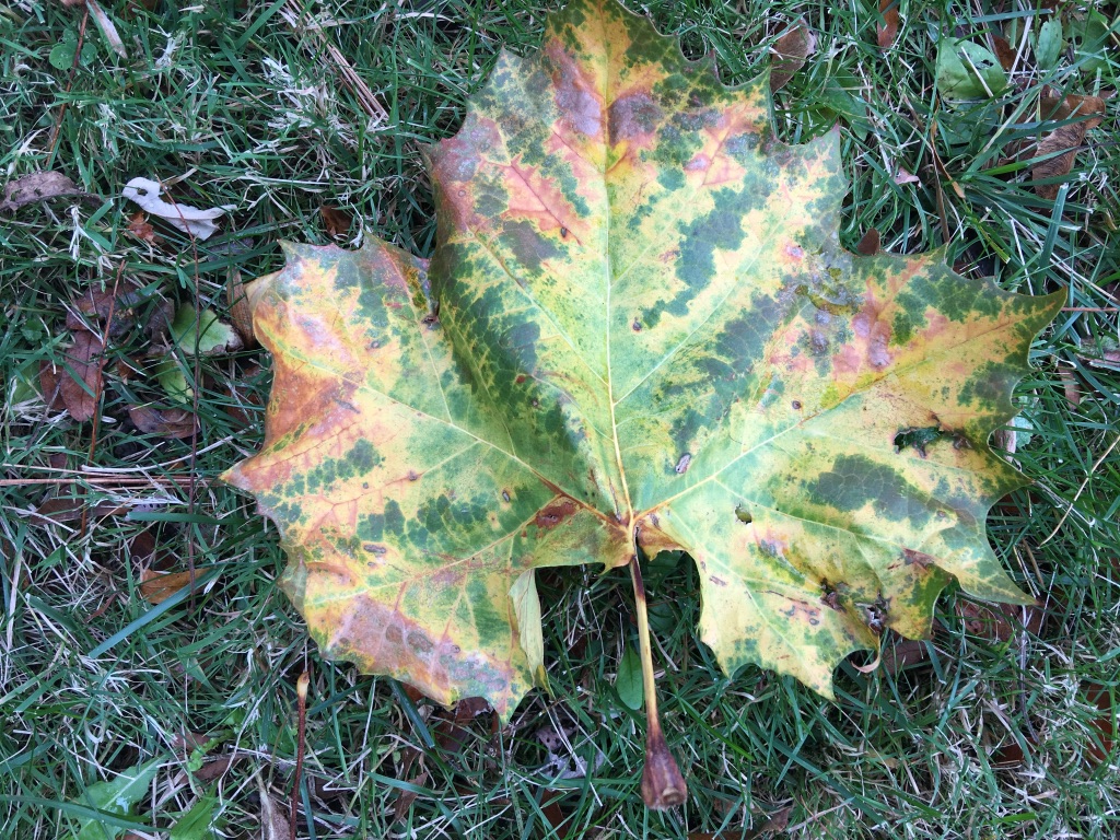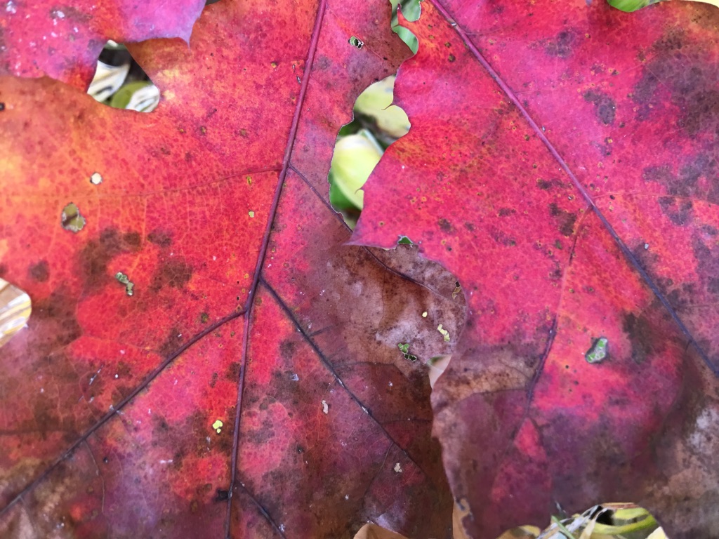 Ever since Robert Macfarlane posted feuille-morte as his online Word of the Day, I have been looking closely at dead, or at least dying, leaves. My sister died at the end of the summer after a difficult illness, so mortality has been on my mind. I cannot write about her, but I can write about fallen leaves. The entry was: