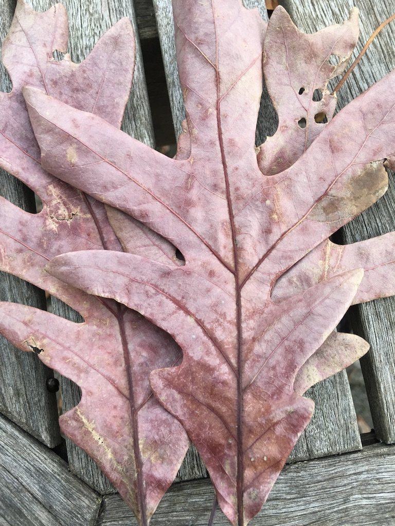 Though I am smitten by the aesthetics of feuille-morte and scumbled russet, I know that they are “workers”–their sole purpose to carry on photosynthesis, taking in carbon dioxide and releasing oxygen. Steven Vogel in The Life of a Leaf writes that “It’s a remarkably multifaceted endeavor, this business of doing a leaf’s business in a physical world, even if directed at a single end” (p.4). Vogel, currently James B. Duke Professor Emeritus in biology at Duke University, sees parallels between their problems and our own as physical beings: