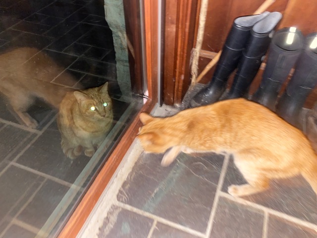 Roanoake was not an option, so Big Red is back up here at our farm where he started out, and Mike is feeding him morning and night. Big Red won’t eat with the other barn cats, so Mike has to feed him separately. Big Red had a huge fight with the current tom cat in the barn and beat him up badly, without ruffling a hair of his own perfect coat it seems. Big Red sleeps in the barn now. Last night was cold and so blustery even the cows were skittering away from the noisy gusts of wind. Big Red came to the sliding glass door of the cottage where we stay and stared at me intently. I did go out and converse with him and stroke his fur–he knows me as he has sat in my lap for hours at Roy’s–but I couldn’t let him in because of our cat, Rex Fernandez, who looks exactly like Big Red, but is only 6 pounds, 4 ounces. Despite his small size and health issues Rex is fiercely territorial. Big Red and Rex stared at each other through the glass for several hours. Unhappy with the situation I went to bed early even though it was New Year’s Eve. When I woke up, Big Red was still there staring through the sliding glass door. I made a cup of coffee and took a blanket out to visit with him. He purred and purred, sniffing my coffee intently. Roy relished his three cups a day. I just called Roy and he said that he was happy living with his daughter. We didn’t mention Big Red.