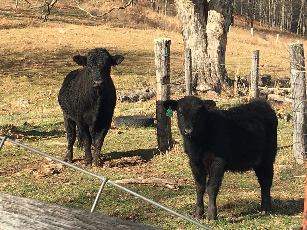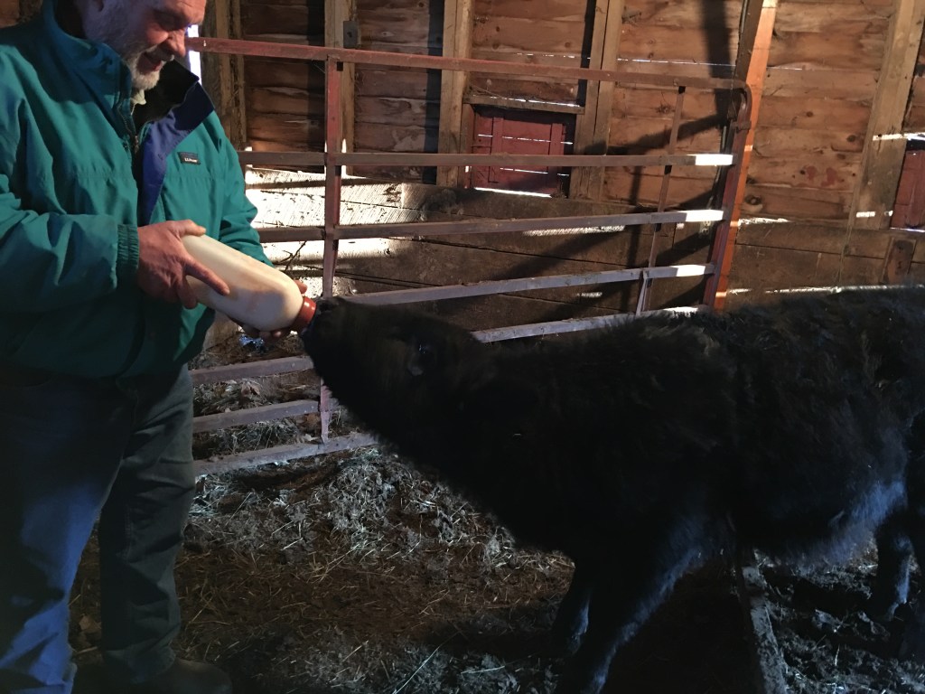The next day was gloriously sunny. I checked in on Isabella, whom we met on our last visit. She was born in September and orphaned in early November when her mother, an apparently healthy 1500 pound plus cow, suddenly dropped dead. Mike thinks that either it was an aneurysm or a case of choking on an apple. (To check whether the cause of death is an aneurysm I learned that one sticks a knife in the body above the diaphragm and watches for a copious volume of blood.) Ever since, he has been bottle-feeding Isabella. She has to be separated from the herd because he can’t go chasing all over the farm with a bottle twice a day. She was lonely until Mike got a new young bull, whom I am calling temporarily Young Bull With No Name. He is a little small and shy. Apparently Young Bull’s previous owner did not socialize him with other cows or people. Mike says that when a stranger approaches, he lifts his head in a kind of fear-and-flight response, which makes Mike uneasy. One of Mike’s grandsons names Mike’s bulls, but he has said that he needs more time to think about a good name. Sally, Mike’s wife, named Isabella.