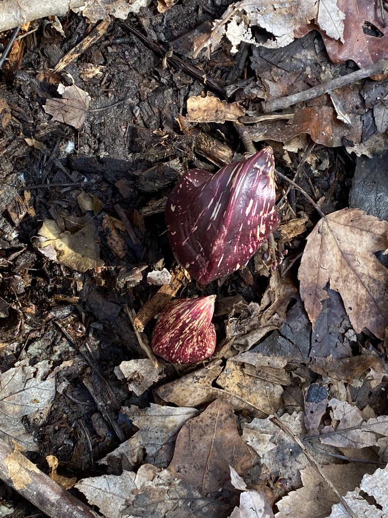 We were following the blue-blaze path, which intrigued Henry. Sometimes he could see four blazes ahead and that kept him dancing forward while brandishing sticks, etc. But, looking at my feet, I saw a raised tuft of dead leaves with a hint of something maroon poking out. Aha! Of course! It was one of the first signs of spring, often missed because so early and relatively camouflaged. A skunk cabbage “flower.” Most people know the giant green leaves of skunk cabbage, which unfurl three feel or more in height in swampy, moist places, but these leaves arise much after the flowers when the weather has truly warmed up. They are hard to miss, because the leaves are so big and green and because skunk cabbages are so social. You rarely just see one. Like people, they prefer to congregate.