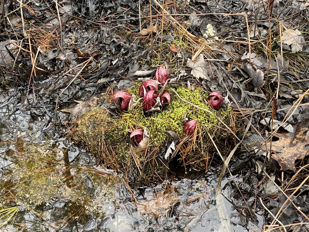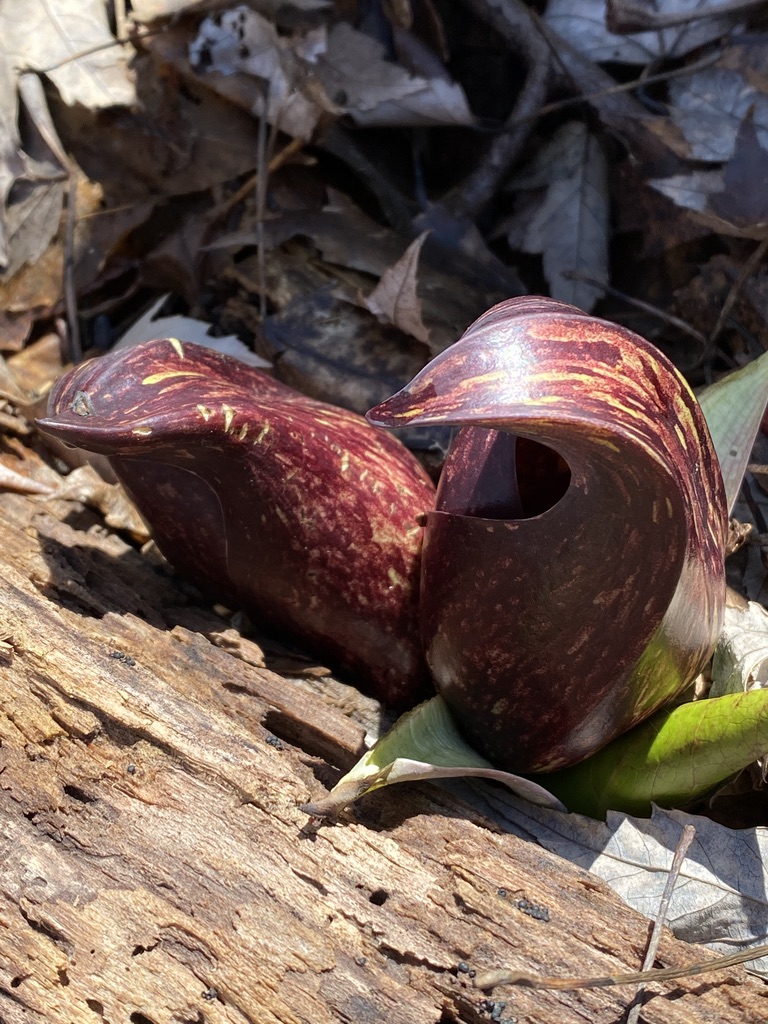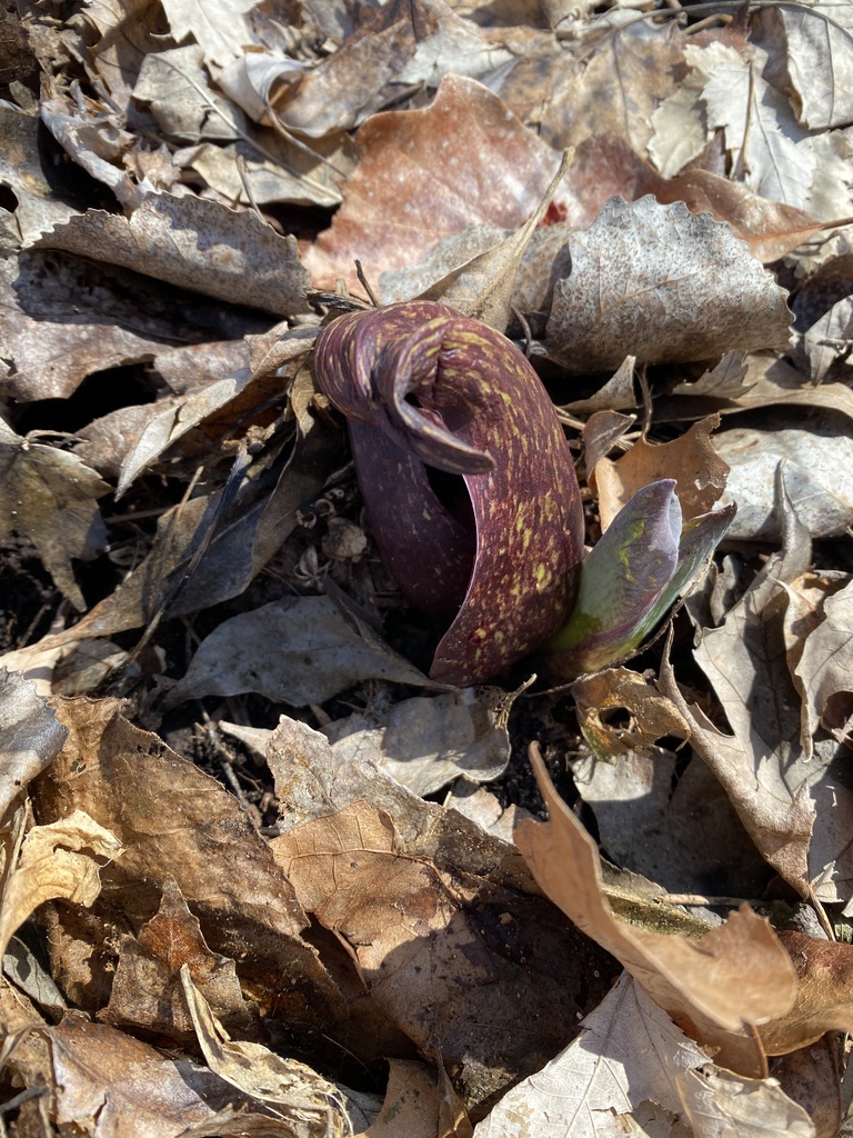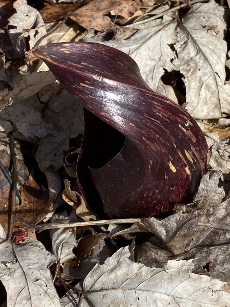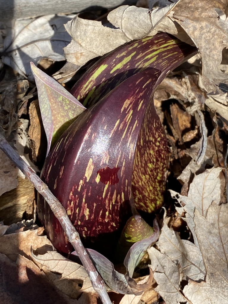 Our walk had turned into an adventure. Watching our feet carefully, we investigated tuft after tuft of raised leaves while ooh and ahhing over new features of each new spathe. In most individuals, the maroon spathe was streaked with green and brown, sometimes a hint of gold. Some were taller, and some were rounder, each twisted in a gnomic fashion, fancifully odd. Inspired by these abundant signs of life, the sense of discovery, and the fact that buried treasure emerges when we least expect it, I said good-bye in much better spirits than when I arrived.