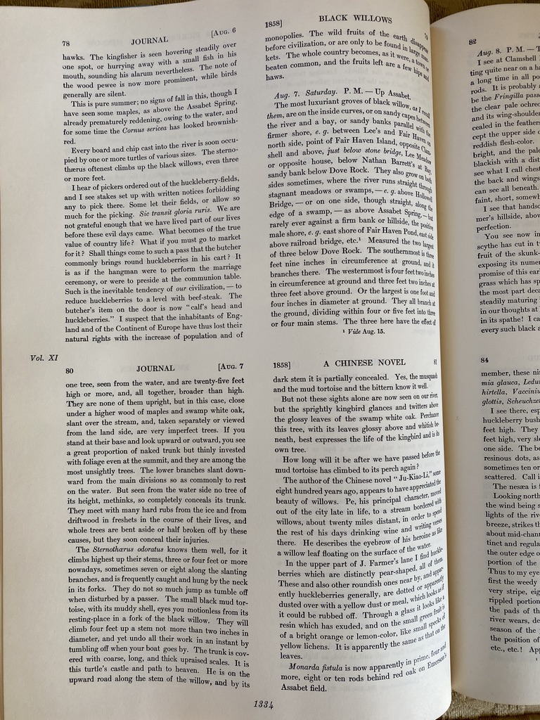 On the way home I remembered that Thoreau often took note of skunk cabbage in his rambles around Concord, Massachusetts, though “rambles” is absolutely the wrong word. He was a documentarian of every detail of nature’s news, with a sharper focus than any wildlife photographer. When I was 16, my parents gave me the Dover edition of his journals, 14 volumes that spanned the years 1837 to 1861, totalling 1804 pages in Dover’s 2-volume edition, every page of which displays facsimile copies of four journal pages, so approximately 7000 pages in total! Fortunately, the Dover edition has an Index, so I was able to read every passage, 42 of them, in which he discusses skunk cabbage.