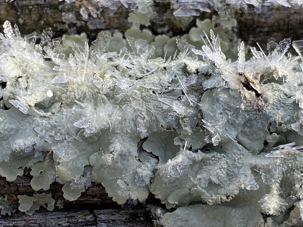 Sadly I missed this drama, but I noticed something that I would not have seen if the cow trimming machine had not been blocking our path. As I opened the gate from the garden area to the pasture, I observed that the lichens that copiously colonize fence rails (epiphytic lifestyle) on the farm were covered in frost. In my research for a book called Moss and Lichen to be published by Reaktion Books in winter/spring 2024, I came across several studies about the ability of lichens to harvest water through ice nucleation. At higher temperatures formation of ice crystals requires nucleating particles, in this case those found on the ruffled surface of the lichens. It was about 28–30 degrees F.
