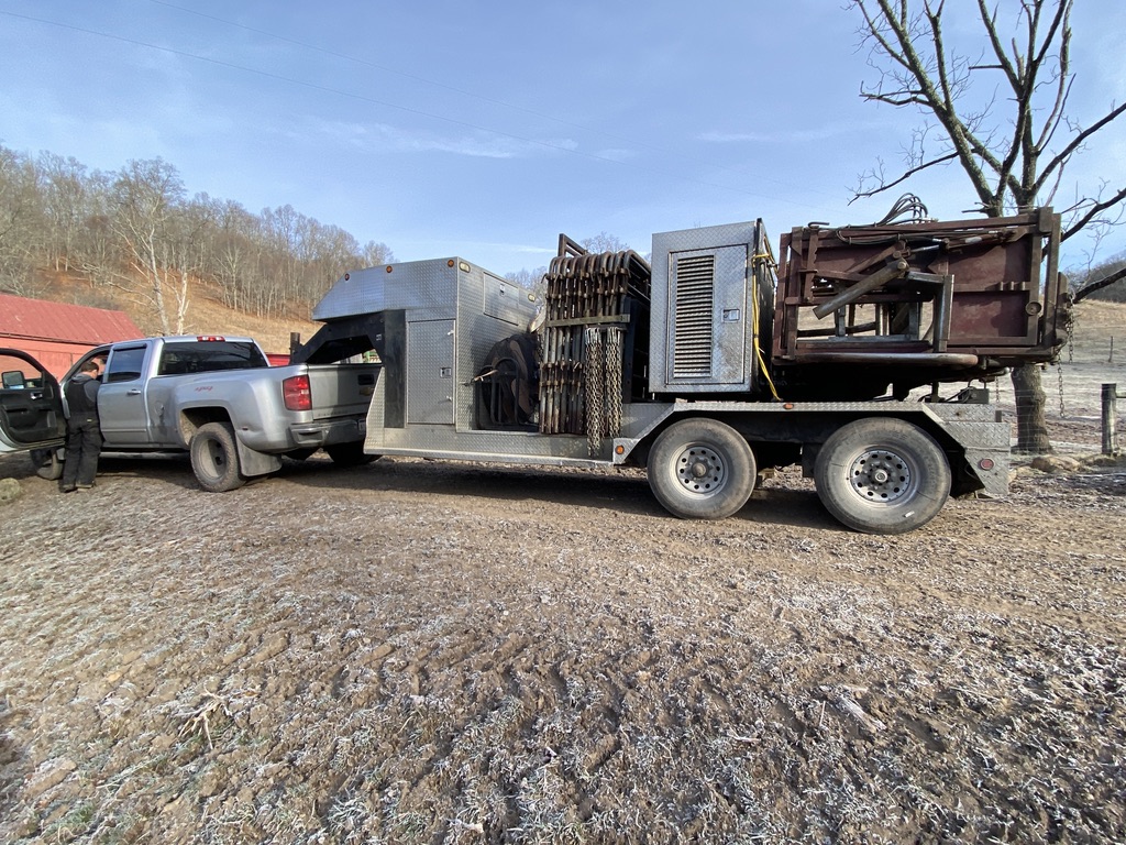 Mike’s cows do not in general need hoof trimming, a practice more common in dairy cows. This cow belonged to his grandson and had been transported from Stanton to Mustoe to be closer to the owner of the device. I missed the actual ‘operation’ but apparently the cow is coaxed into the apparatus, fastened in tightly, and then turned on her side so that the hooves are presented to the trimmer for easy trimming. The cow walks off eventually, presumably feeling much more stable on her feet.