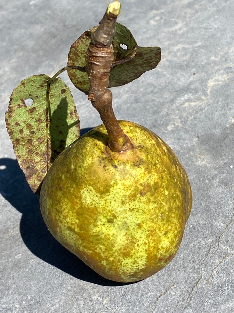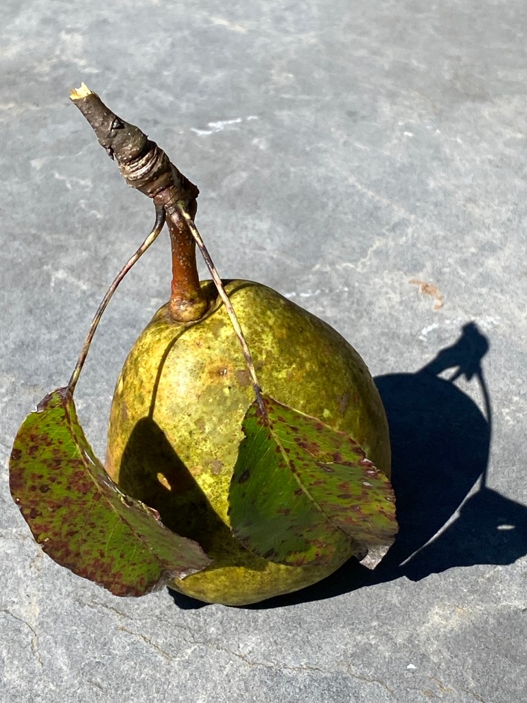 Each pear is a work of art with a myriad of spots and speckles and blemishes, documenting the history of growth day by day. I pick a few from the ground and photograph them. Each one is perfect in a slightly different way.