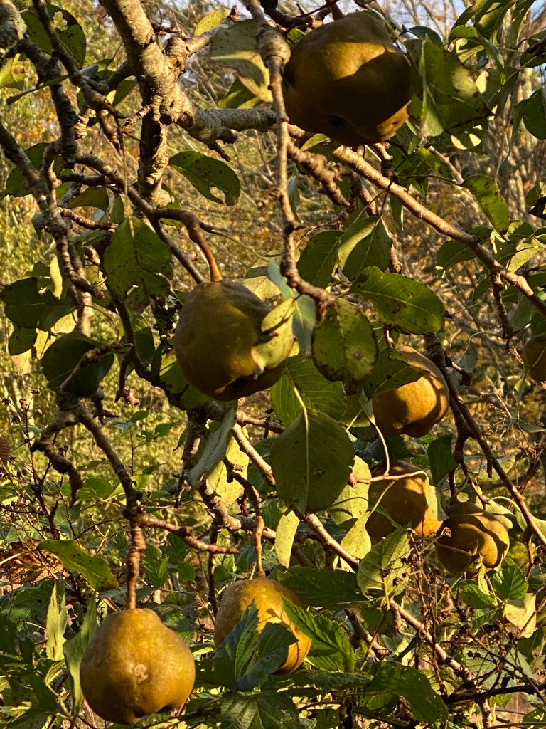 On a recent trip to Vinegar Hollow I made a point of reacquainting myself with an old friend. It is out of my usual view, perched on a steep little hillside up above the root cellar. The pasture around it is deeply rutted by cow trails and tough tussocks of tall grasses. It takes some effort to come face to face with this friend, as one is either looking up at it or looking down upon it. Since I was very young, it has looked very old, but now I am catching up in age, and it seems to be reversing course, looking younger. I have never seen a more bountiful crop of pears even though August and September were droughty. The pears are large, green gold, gleaming in the sun, holding on tightly. They cannot be pulled off easily. They seem to prefer to fall on their own terms.