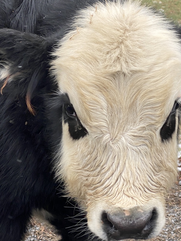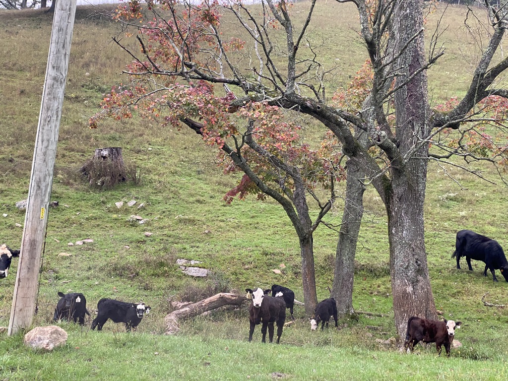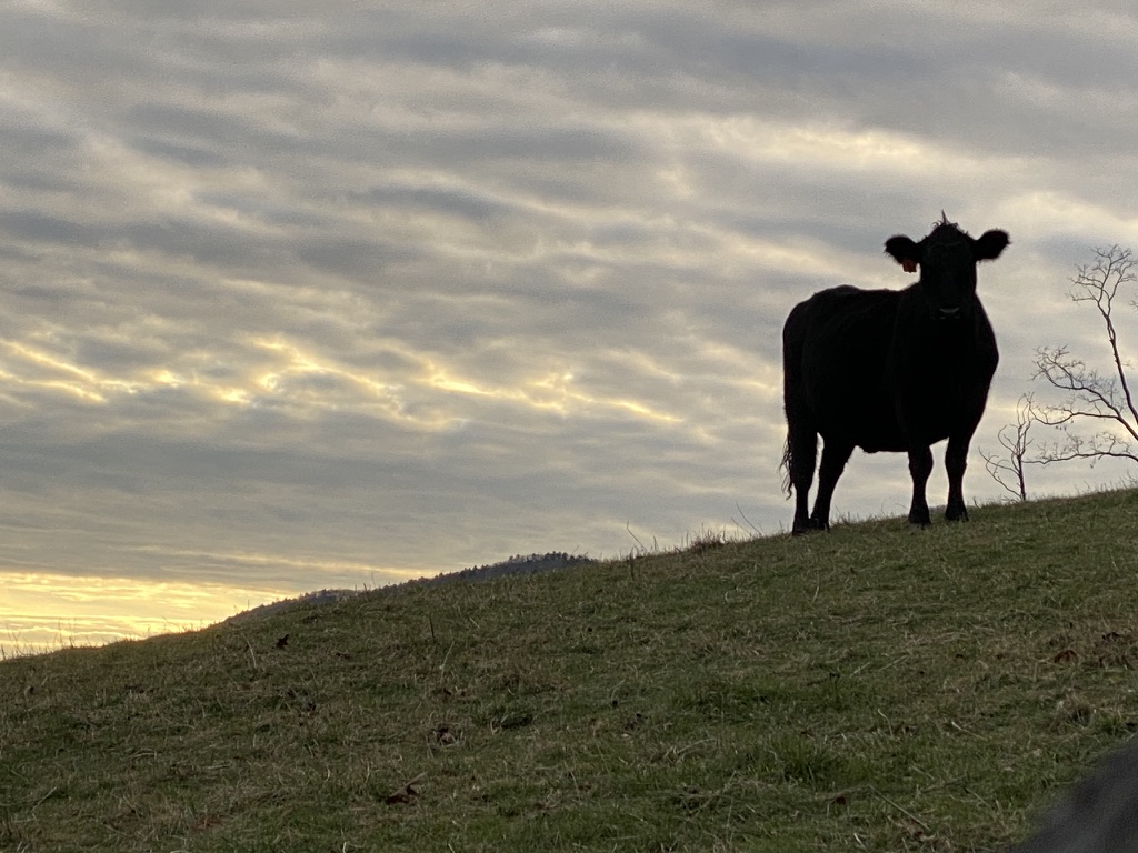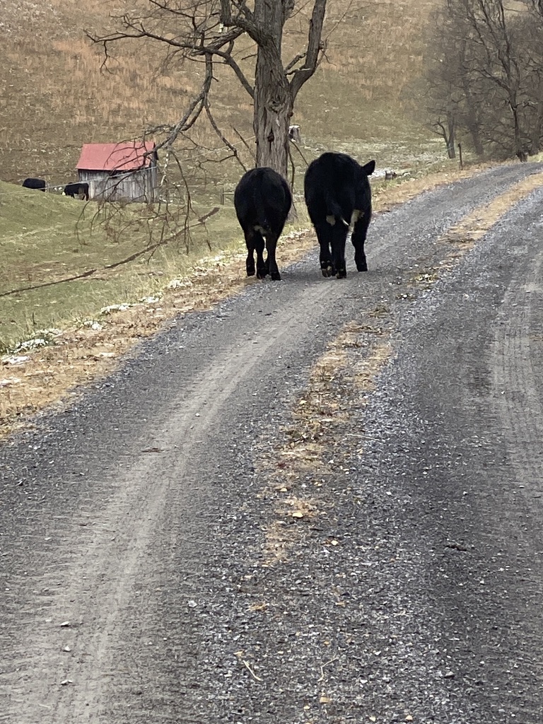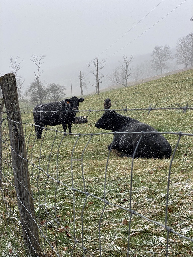 November 2024: The first snowflakes of 2024 have landed in Vinegar Hollow. They are lying in the pockets of the fallen beech and oak leaves, clinging to the rhododendron leaves, and adding frosting to the landscape. I am also cow-watching from my writing desk, between the fireplace (warm) and the sliding glass doors (cold). I am studying a cow with an orange ear tag and another one seated in profile. She is sitting as snowflakes whiten her coat. In profile she looks like a buffalo or rather a bison. (A recent discussion among biologist friends has clarified the fact that the American “buffalo” is technically a bison, whose scientific name is bison x 3, i.e., Bison bison bison.) A word about bovine terms: heifers are female calves, bull calves are just that, cows are adult females, and bulls are adult males.