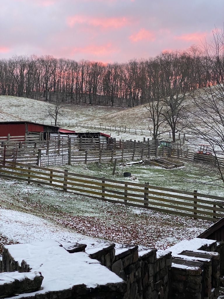 Cows in all seasons come up in the late afternoon through the orchard meadow and sit on the opposite side of the fence from garden. For me, it’s a visit that I can count on. They often just sit or stand on the other side of the fence, staring into the distance.I am developing a theory that they are ruminative creatures in more than just the literal sense. Mike, who owns the cows that graze here, says they are just like people, each with their own unique personalities. I was hoping they were a step up from humans because of their grounded lifestyle. In any event, as I eye this “buffalo”-like cow, I see she appears to be chewing in the literal ruminative sense of the word, imperturbable even though there is a winter storm advisory until 10:00 pm tonight. I am glad that she and her companions are near. We have almost constant weather advisories. Two nights ago there was a wind advisory and soon enough a whirling dervish of a storm came howling through the hollow as night fell. It groaned and moaned before abruptly leaving at dawn. I am told there were 300 power outages in the area, but I was spared and felt very grateful to be able to have my morning coffee, as on my previous visit I was without power for nearly 48 hours.